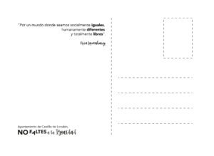 La campaña está compuesta por carteles que se han repartido por nuestra localidad y de una pequeña postal que hace referencia a esta lucha que debemos de mantener en activo. Dicha postal se va a repartir por las diferentes Centros Educativos de nuestro municipio, ya que es primordial concienciar, sobre todo, a los más jóvenes, serán ellos los que marcarán la nueva sociedad.